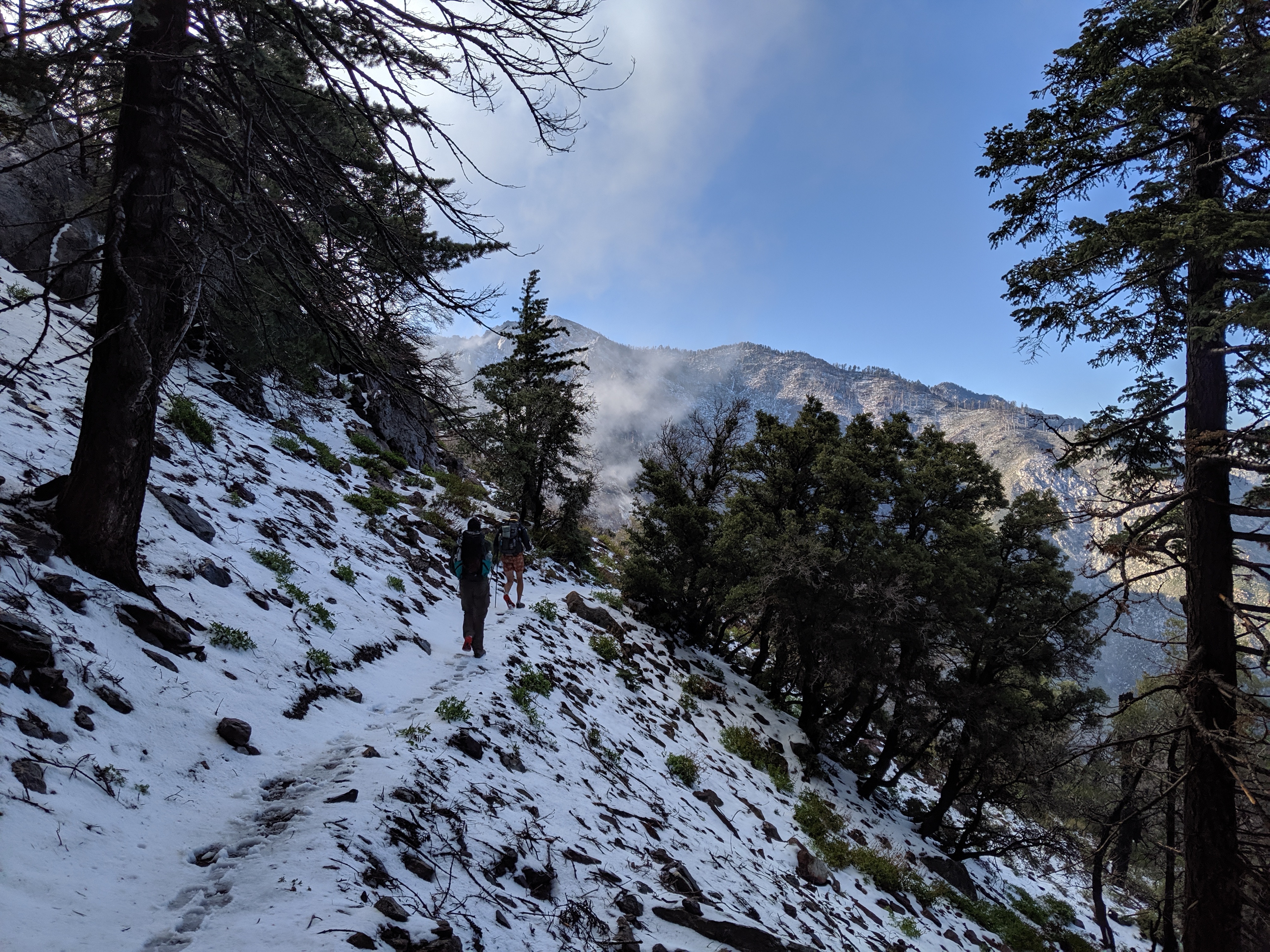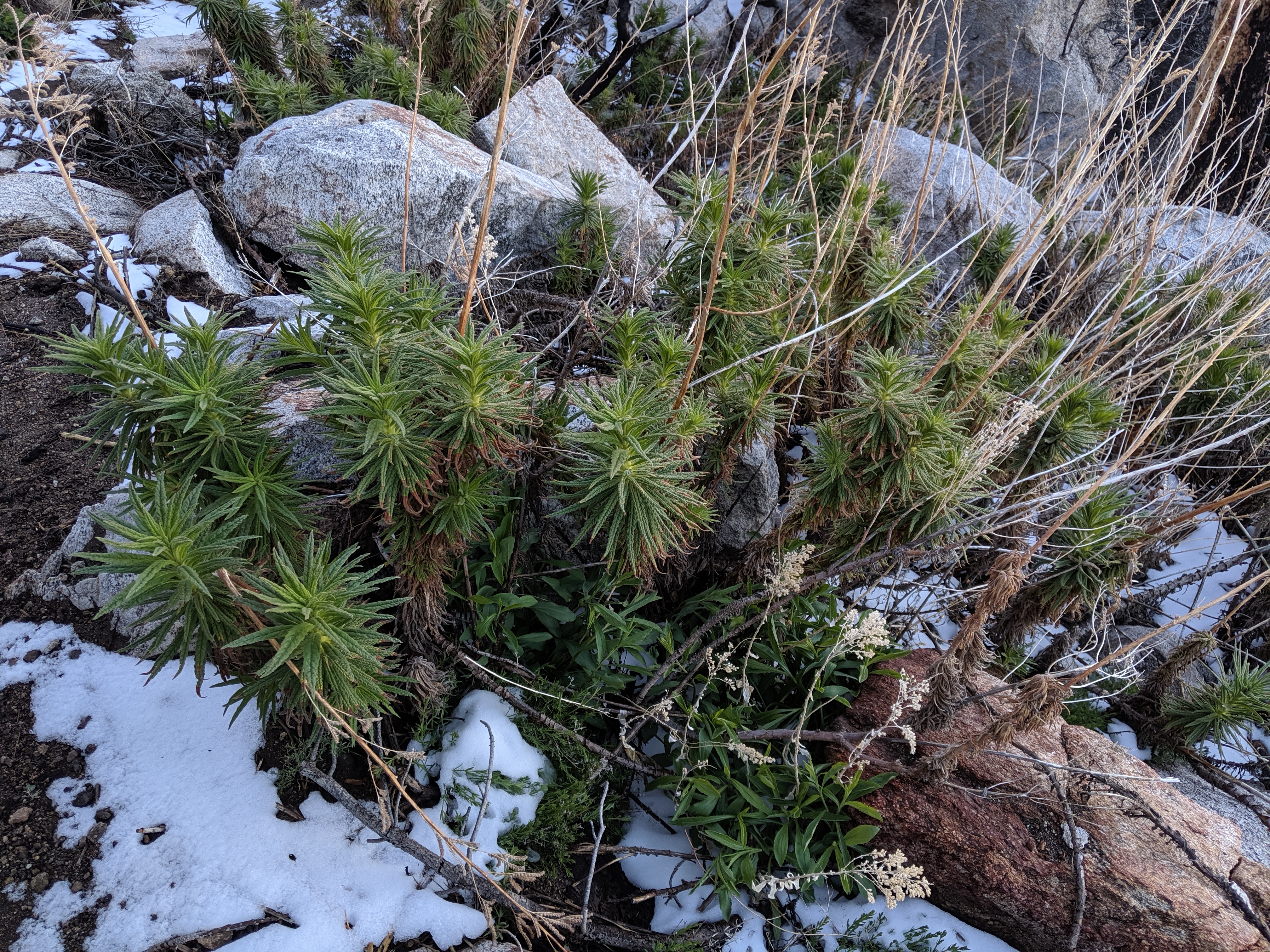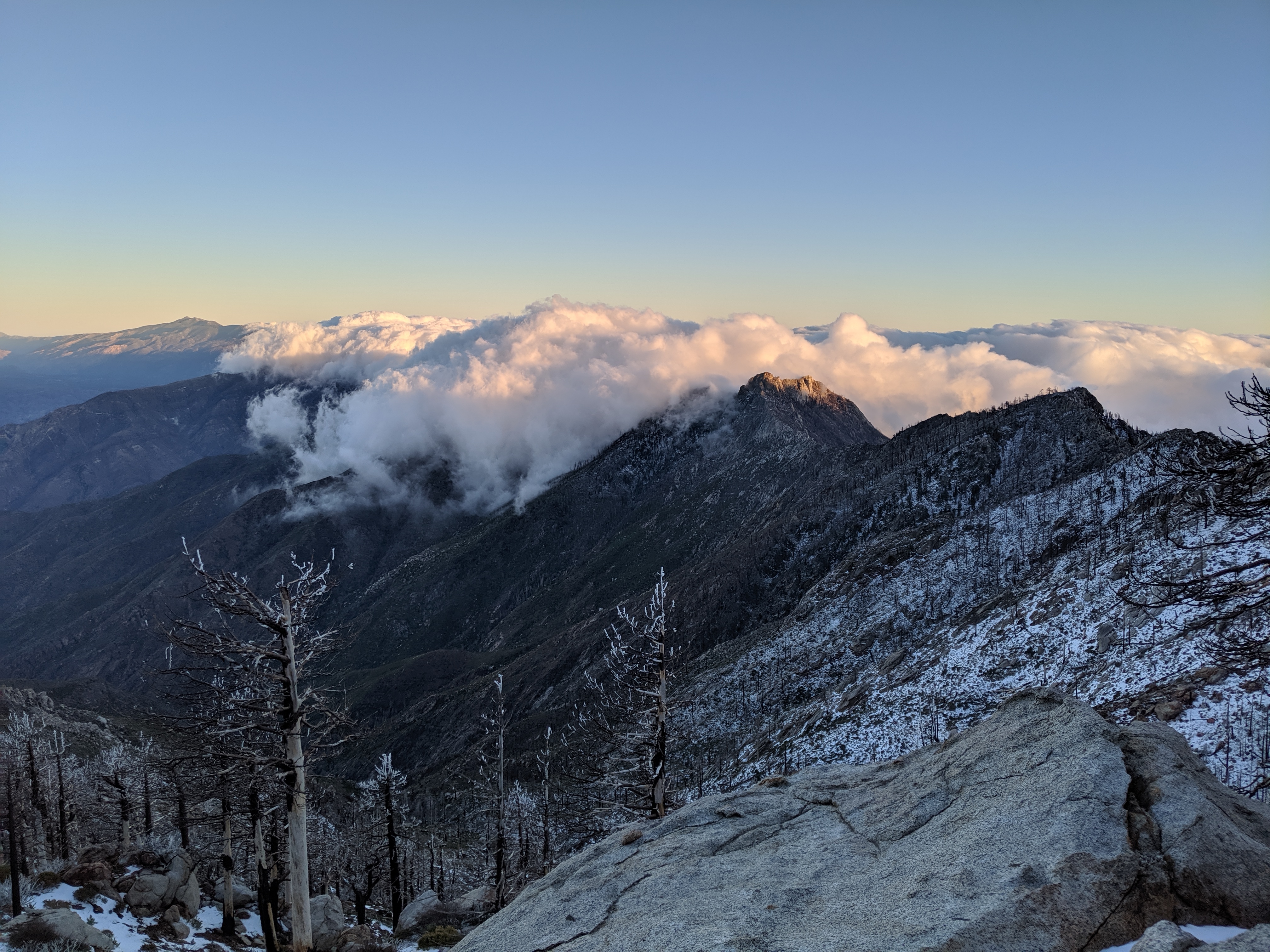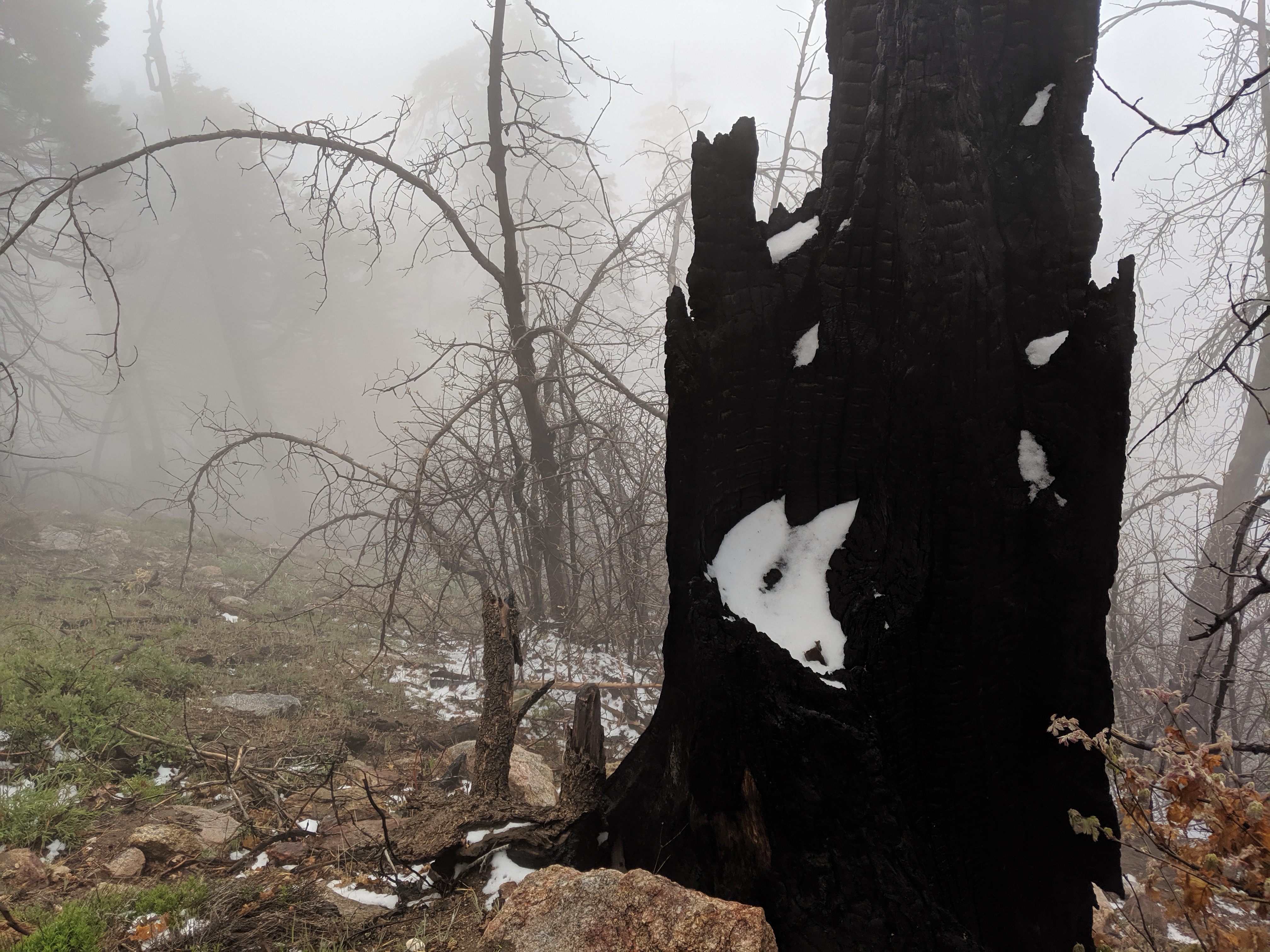From about 7100 - 7300 ft., the landscape was recently affected by fires. This year, in fact, was the first year the whole section was available and didn’t require alternate routes. As such, we saw sage brush and poodle dog bush thriving up and down the trail. As the elevation went up, the snow became more and more common. By the last two hours of the day, we were hiking across packed snow (melted, frozen, remelted, and refrozen a few times over the last few days). It was unlike anything I had seen on the trail so far.