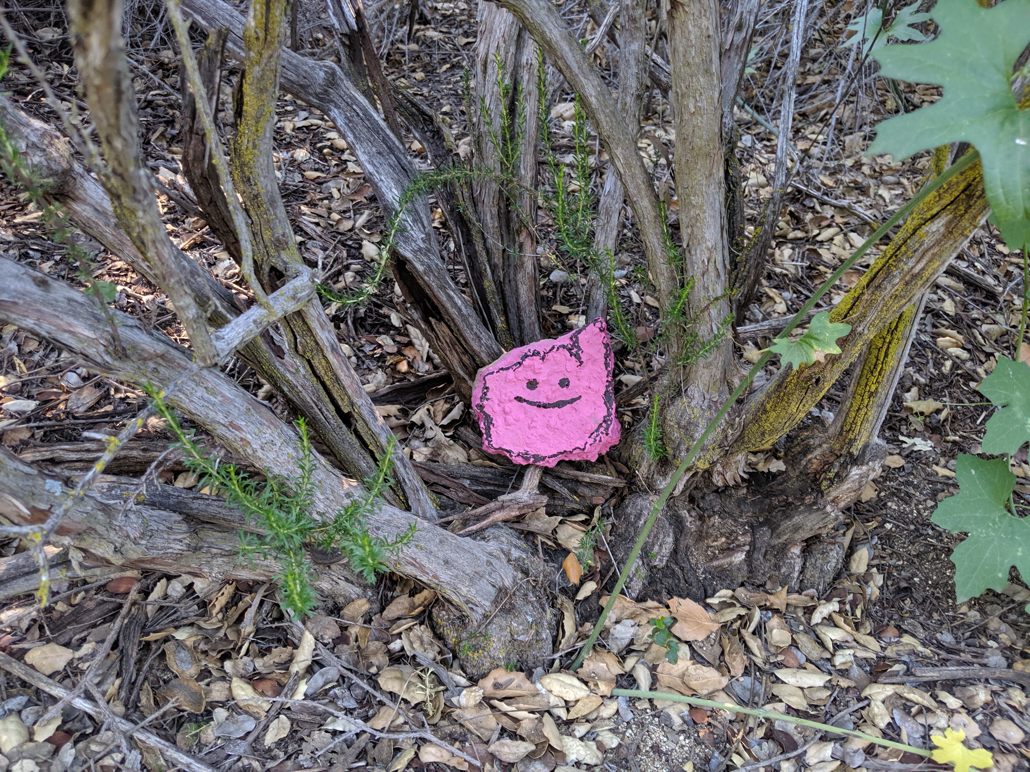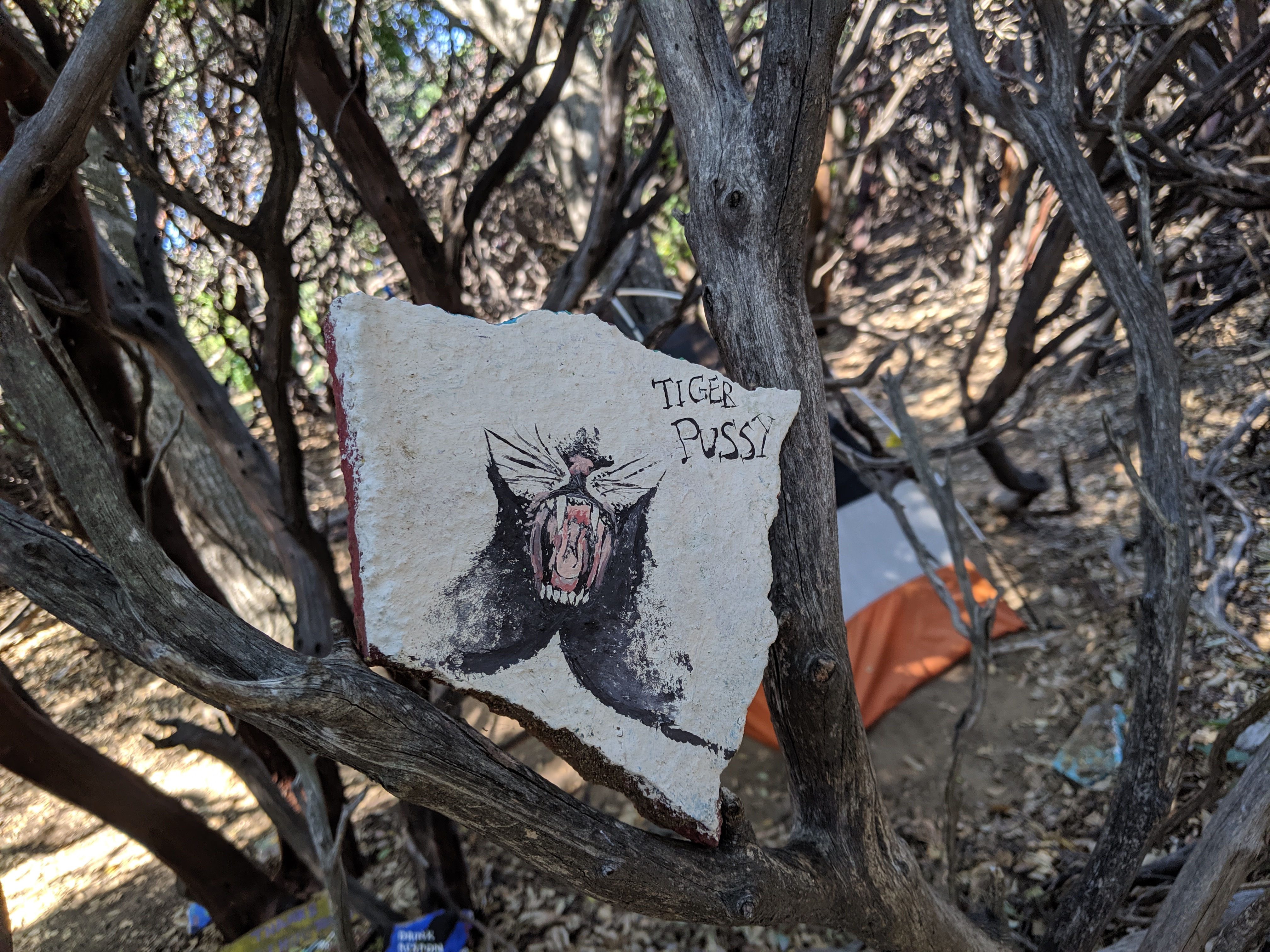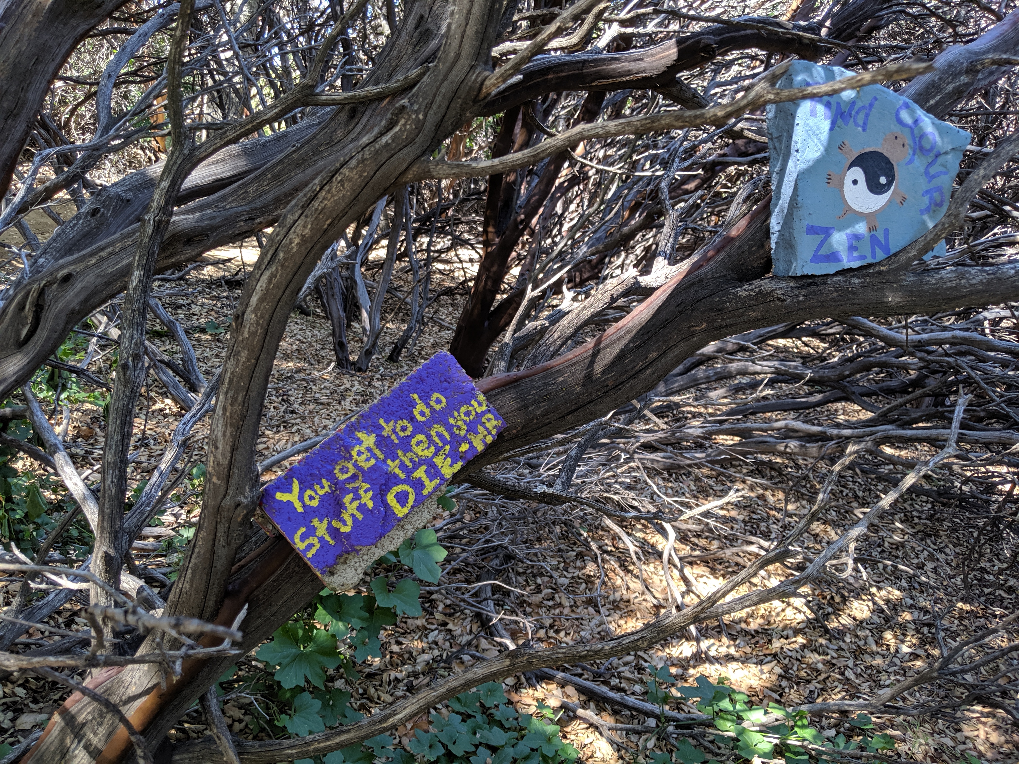 We got a quick look at the rules and made our way past to setup camp. Behind the two gates separating the house from the yard is a large manzanita forecast with small footpaths and tentsites. Speckled throughout the forest are rocks painted by previous hikers with all manner of decorations.