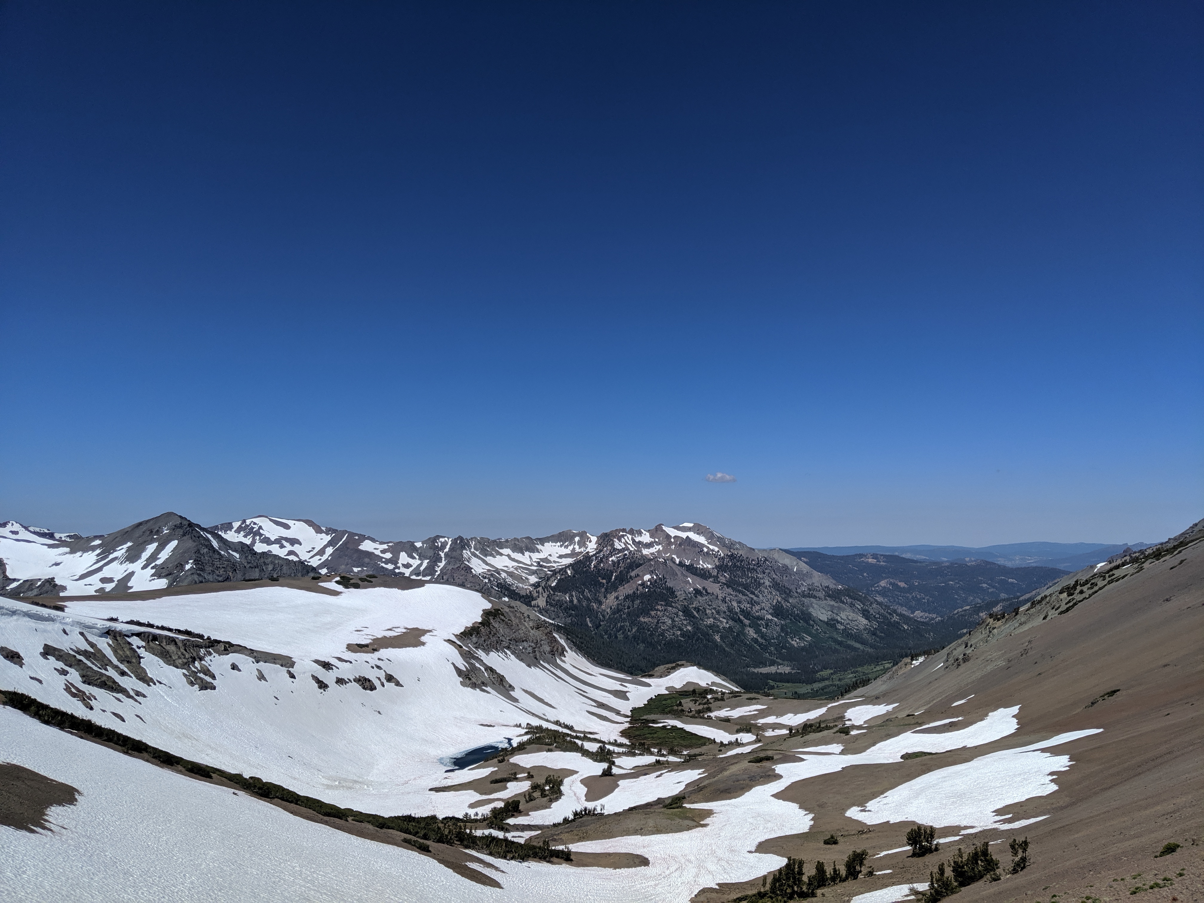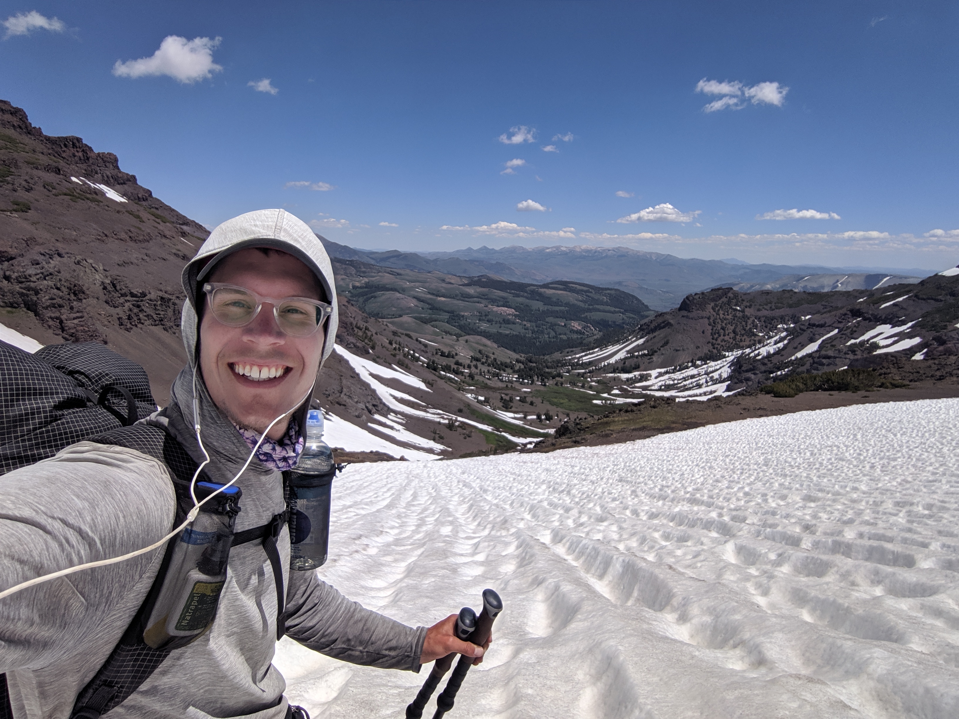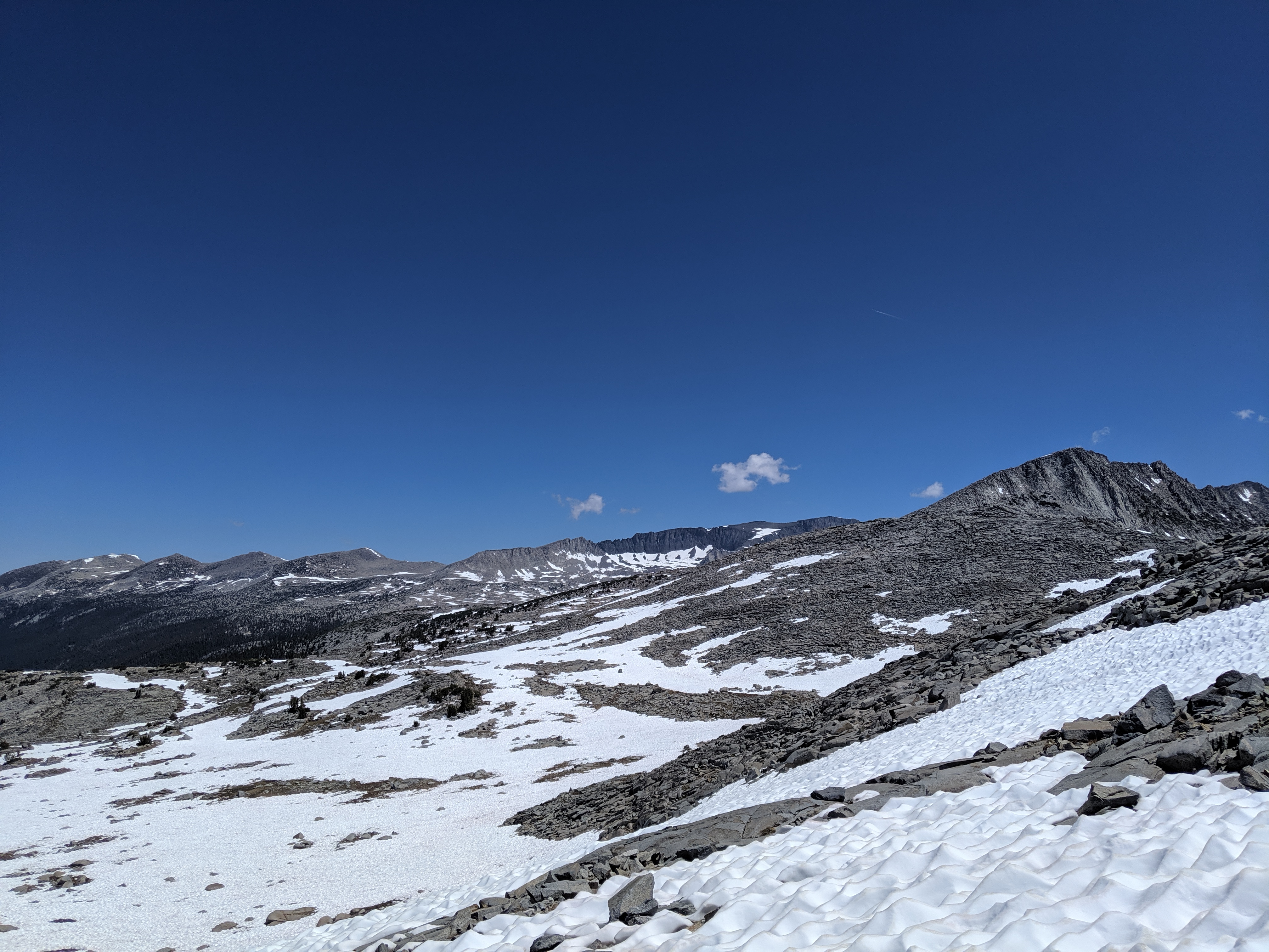 The day started like any other normal day in the Sierra. I wake up around 5:00 AM, I convince myself to get up and moving, and I start packing up. As I inhale a couple Pop Tarts, the mosquitoes start to attack. I finish packing up, brush my teeth, and get hiking. Iām going downhill for about 5 miles, and then uphill for 13. The uphill starts and the snow begins. The mosquitoes stop. The wind kicks up. All of this, save for the incline, is perfect. After getting to about 10,000 ft. and doing a gnarly climb up mixed skree and slushy snow, I get this view: