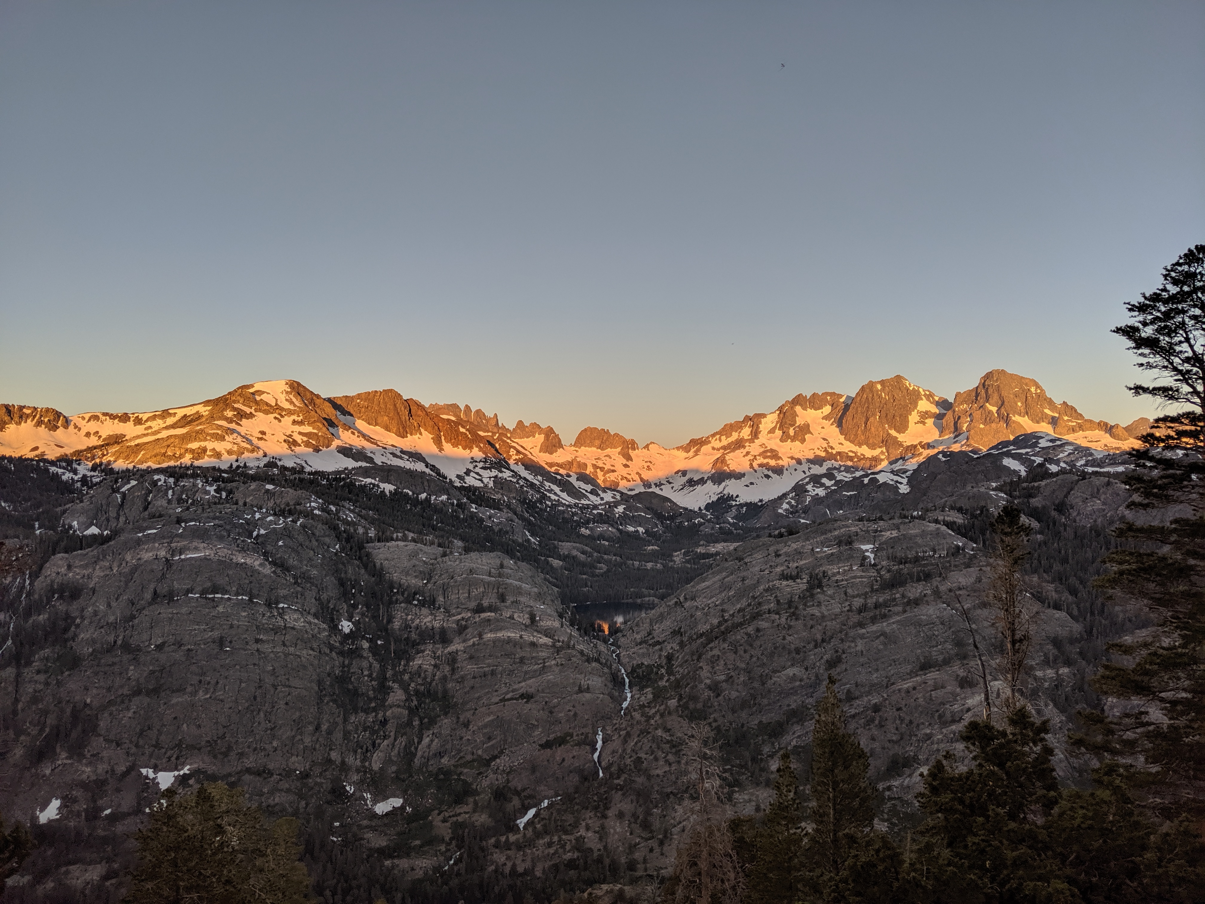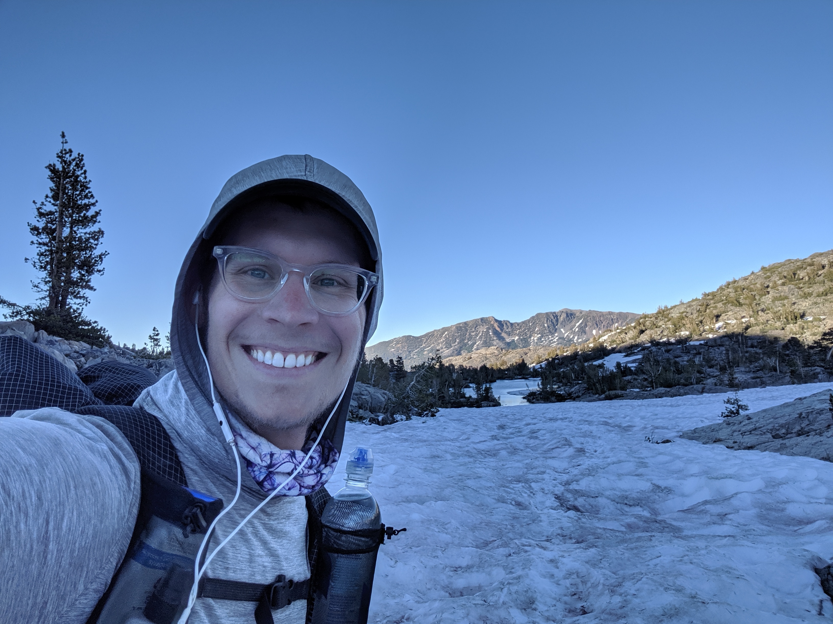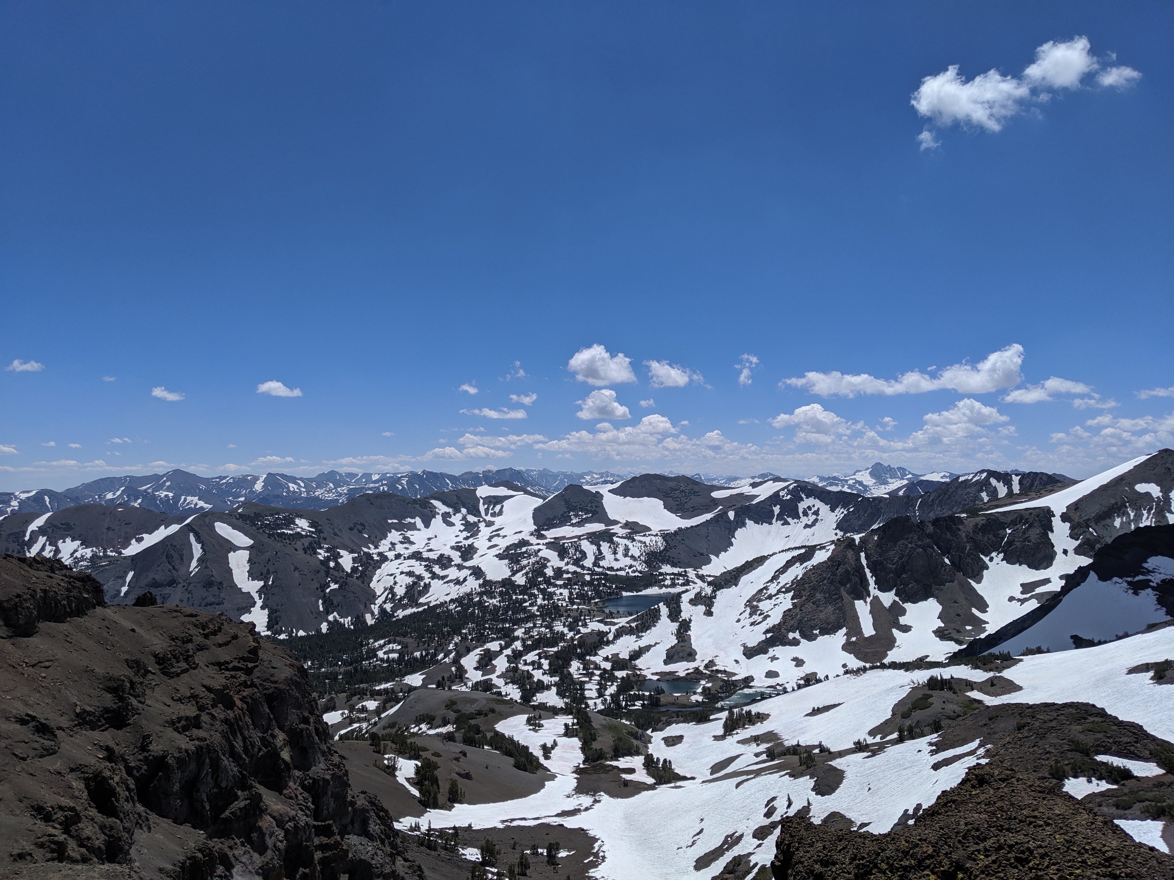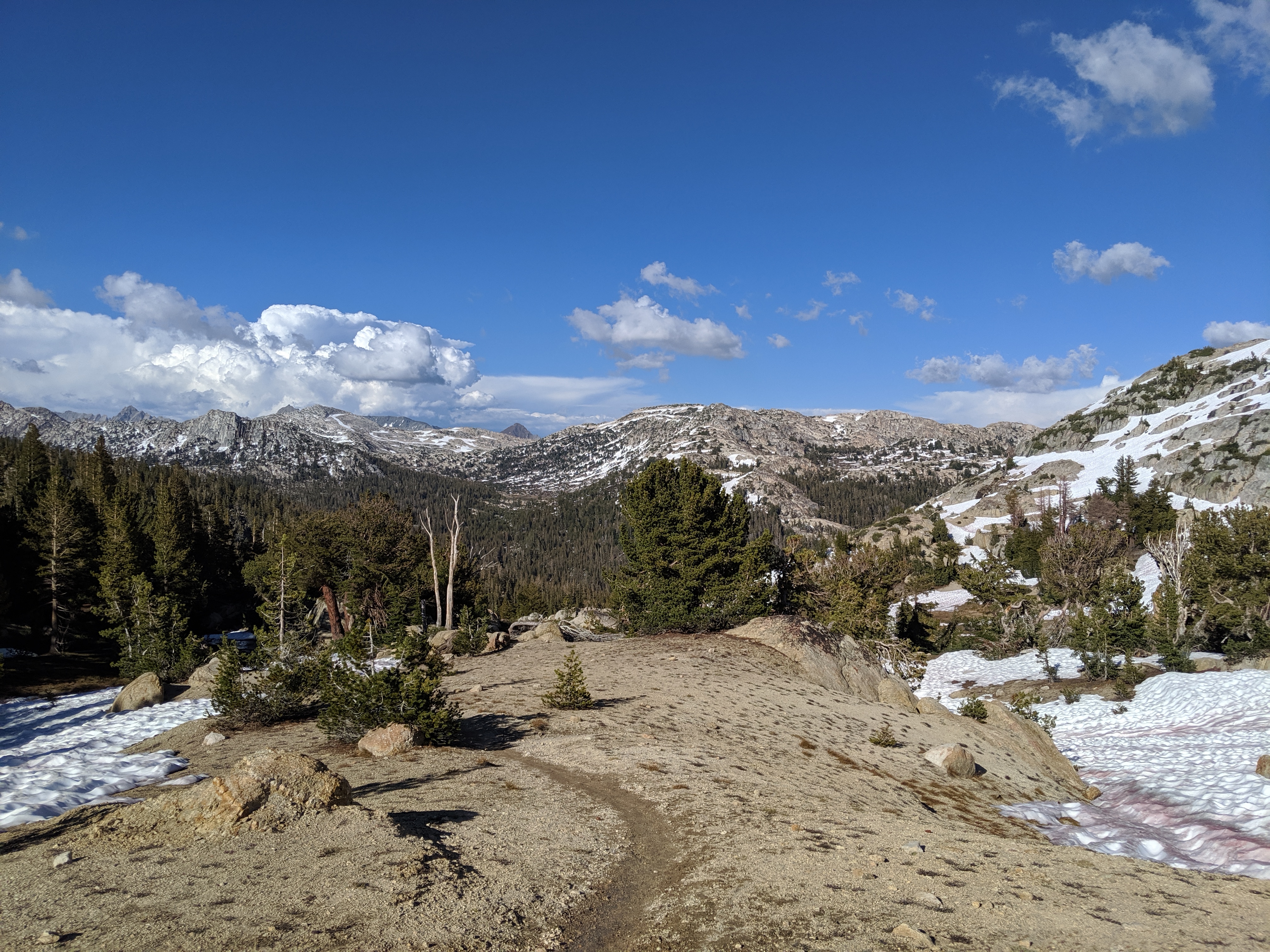 The day started like any other normal day in the Sierra. I wake up around 5:00 AM, I convince myself to get up and moving, and I start packing up. As I inhale a couple Pop Tarts, the mosquitoes start to attack. I finish packing up, brush my teeth, and get hiking. Iām going downhill for about 5 miles, and then uphill for 13. The uphill starts and the snow begins. The mosquitoes stop. The wind kicks up. All of this, save for the incline, is perfect. After getting to about 10,000 ft. and doing a gnarly climb up mixed skree and slushy snow, I get this view:
