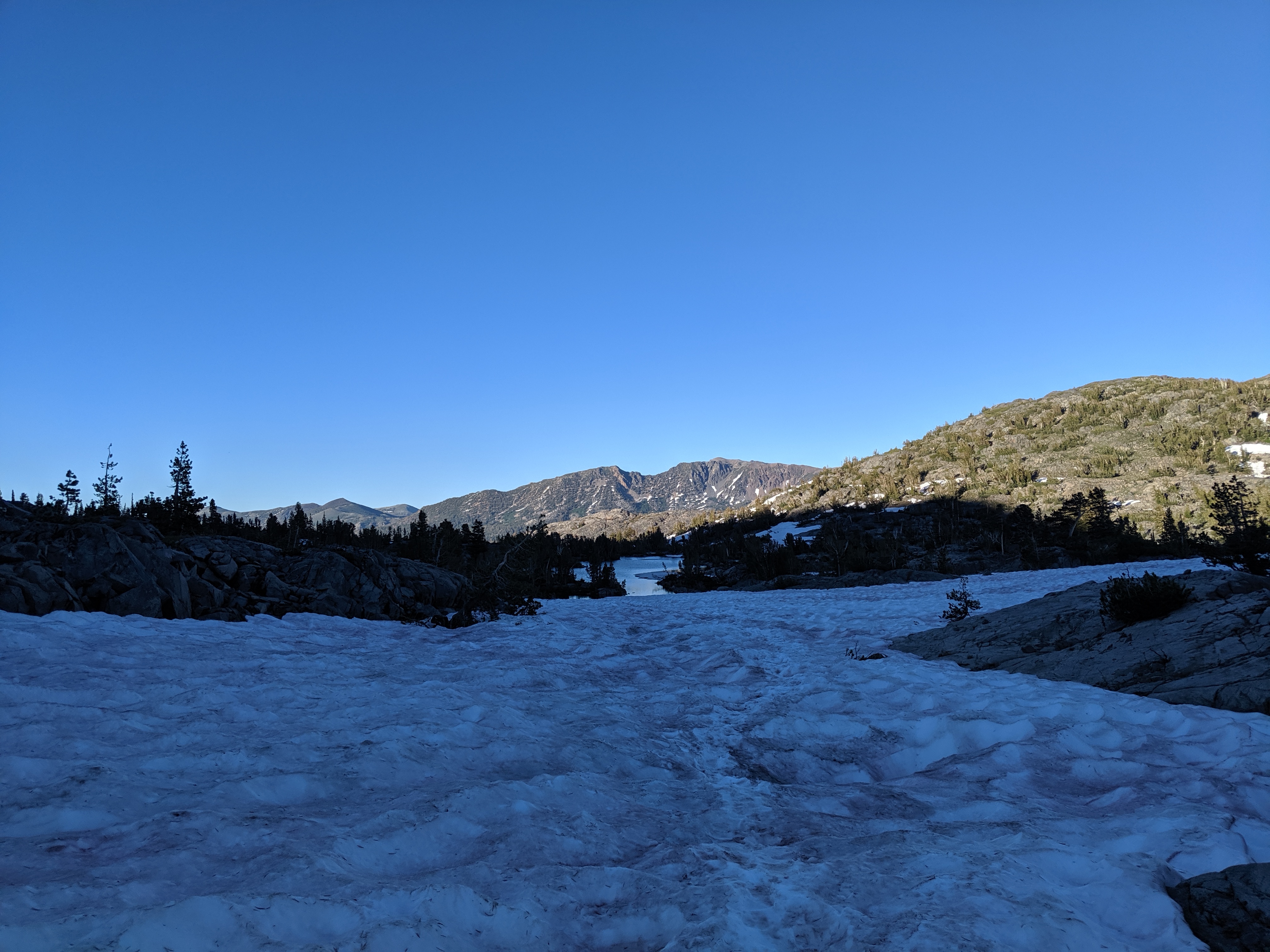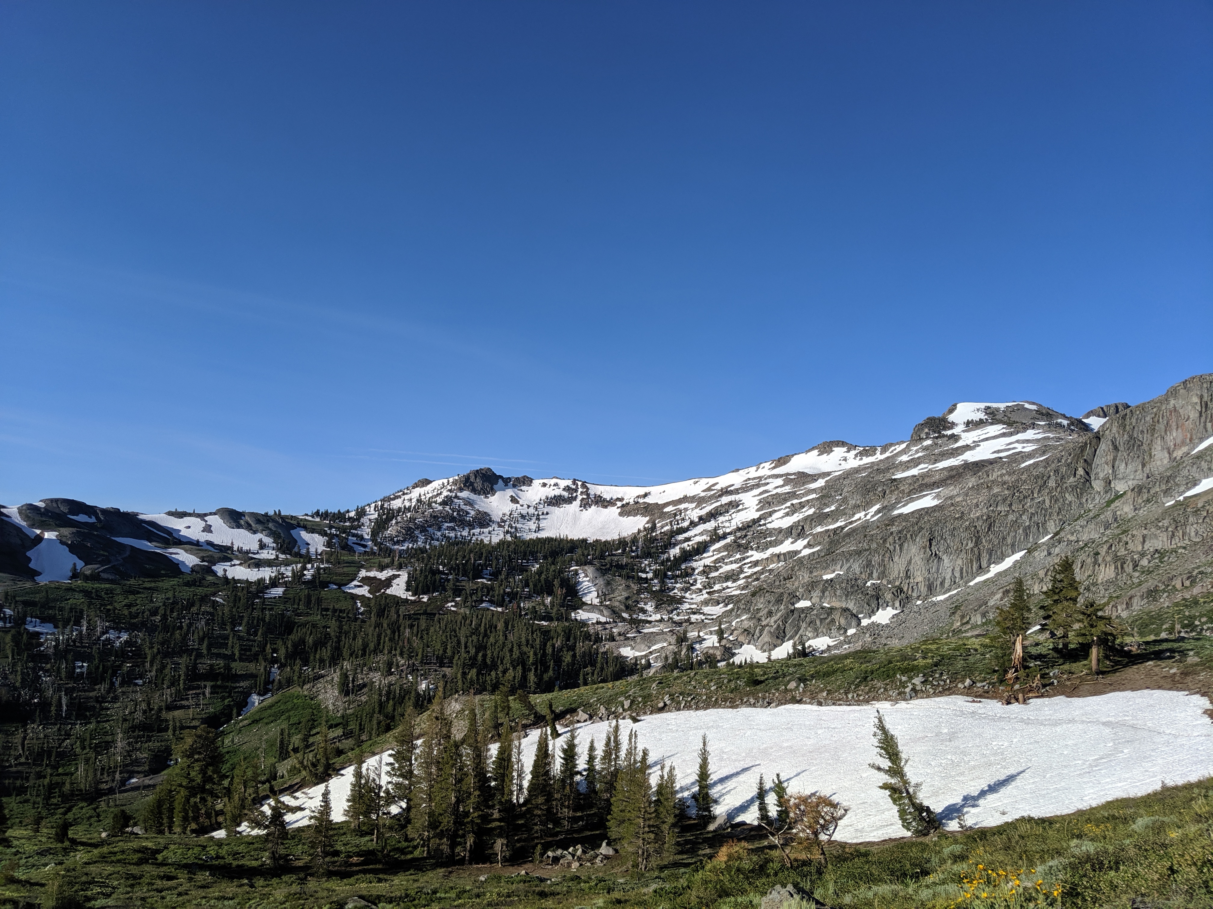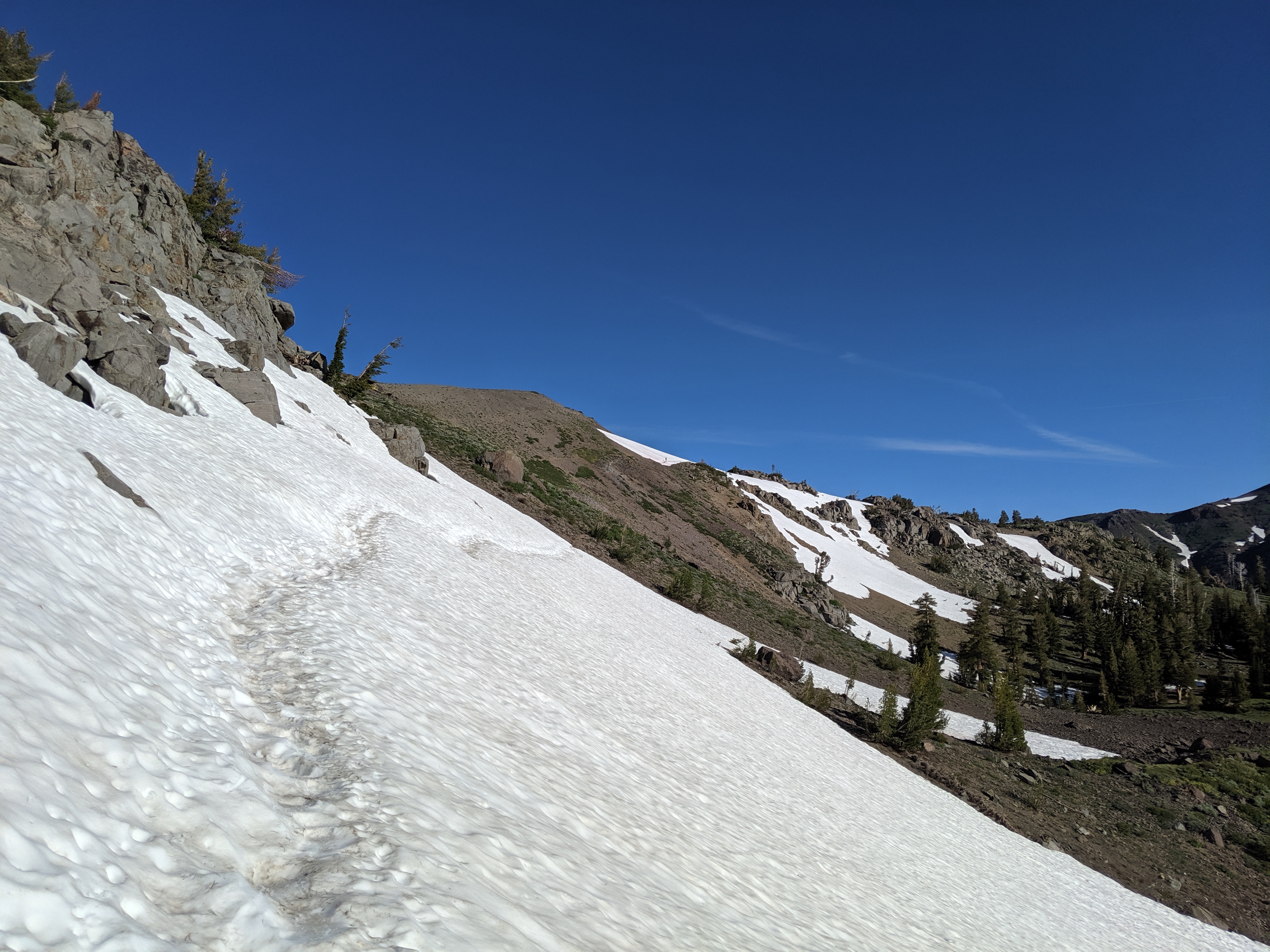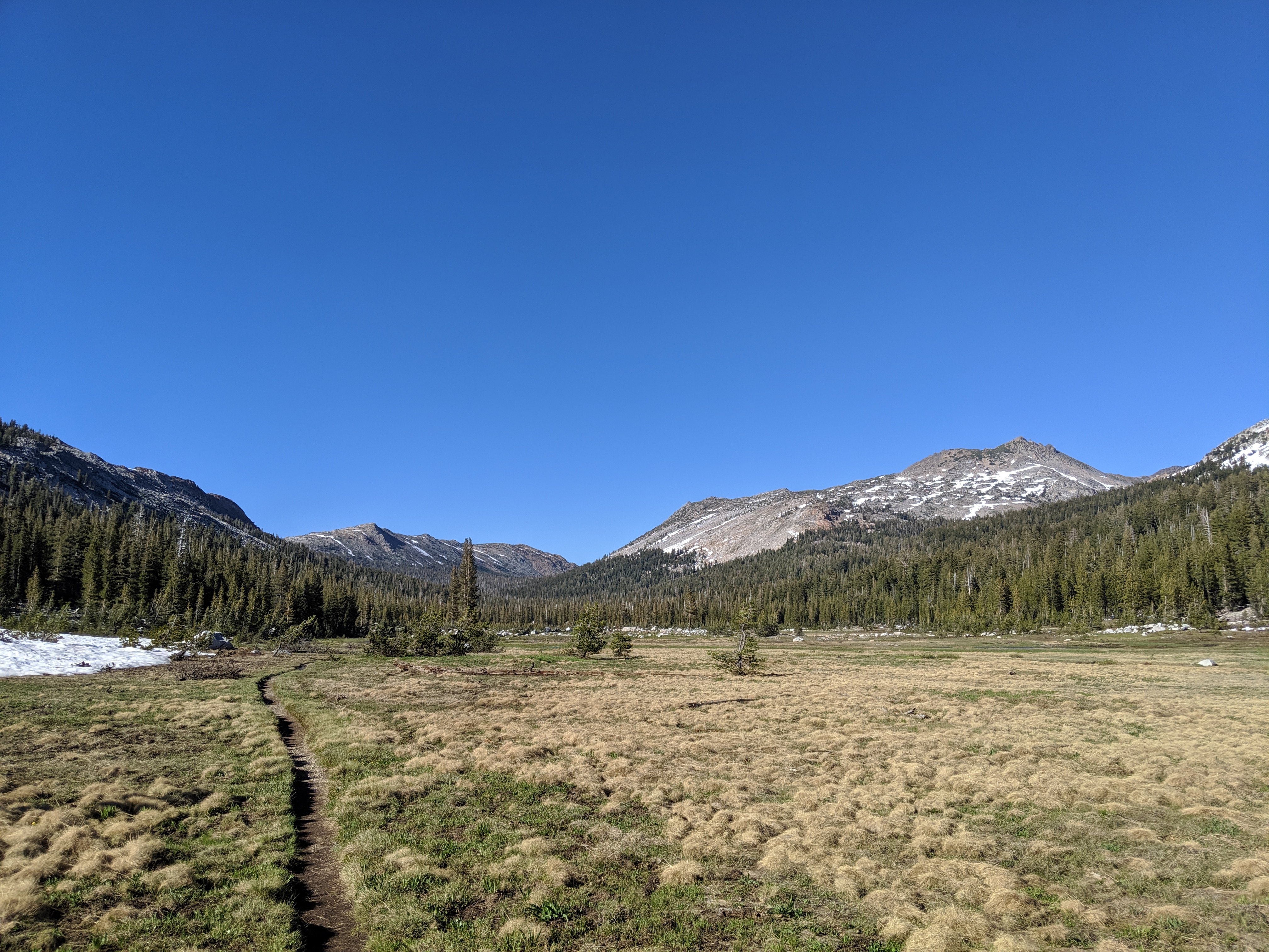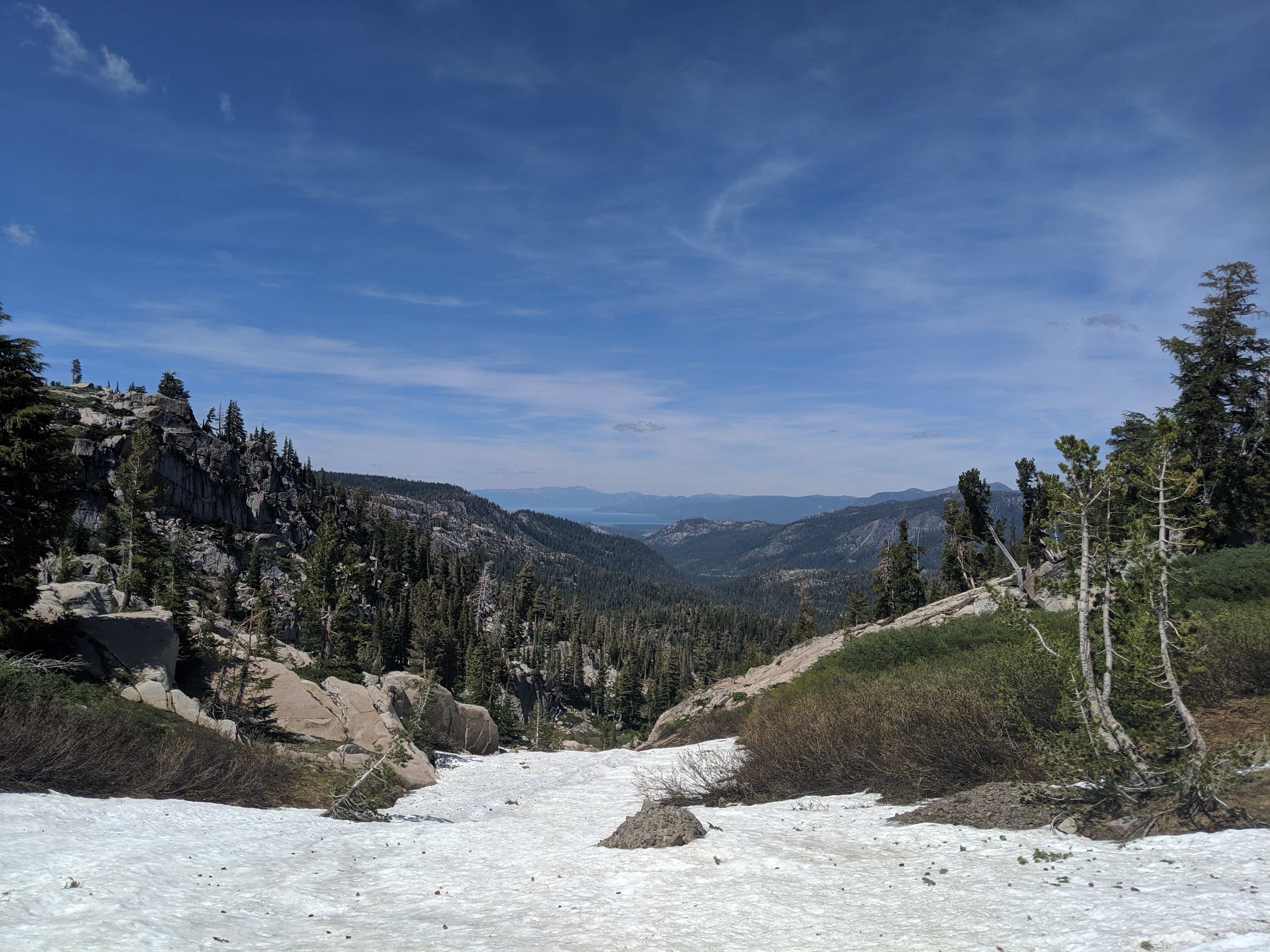 The rest of the day was as predictedārelatively mellow grades, no water crossings requiring getting wet, and amazing views of the waning mountains and retreating snow. I deliberately went slow and stopped shortly after 4 PM just so I wouldnāt be too bored tomorrow. My plan is to hike to just a couple of miles away from HWY 50, and then hitch into South Lake Tahoe early on Thursday.