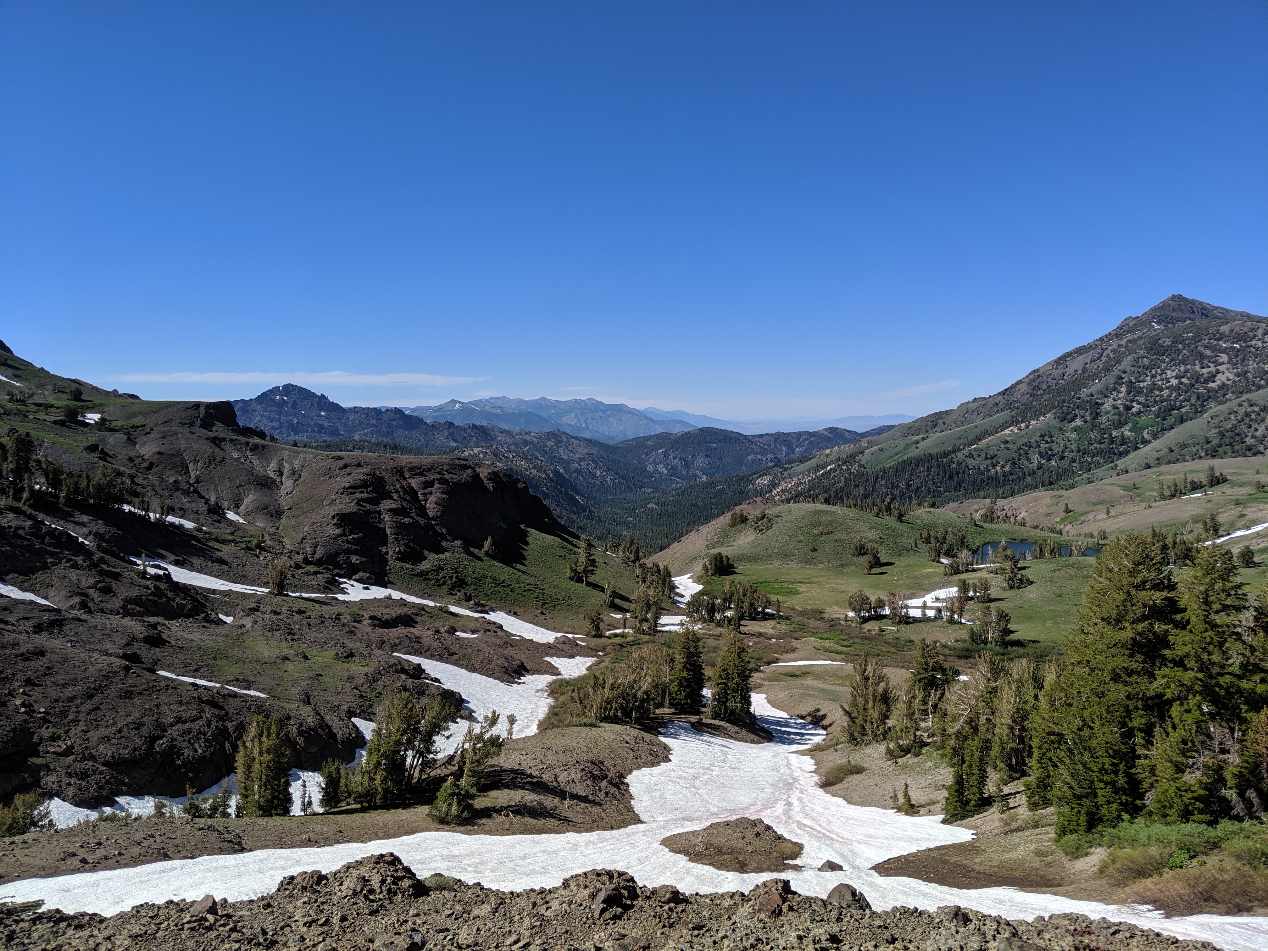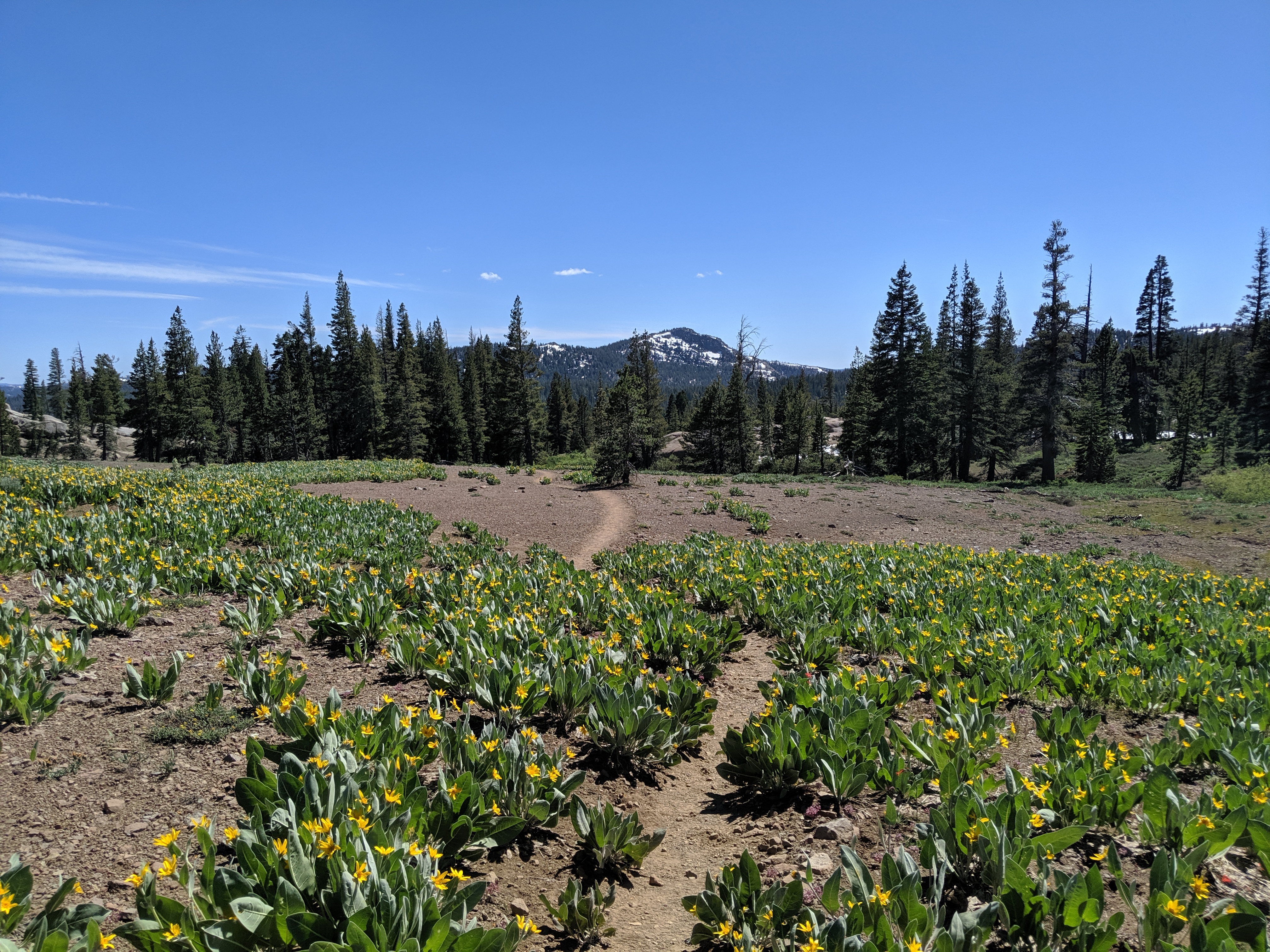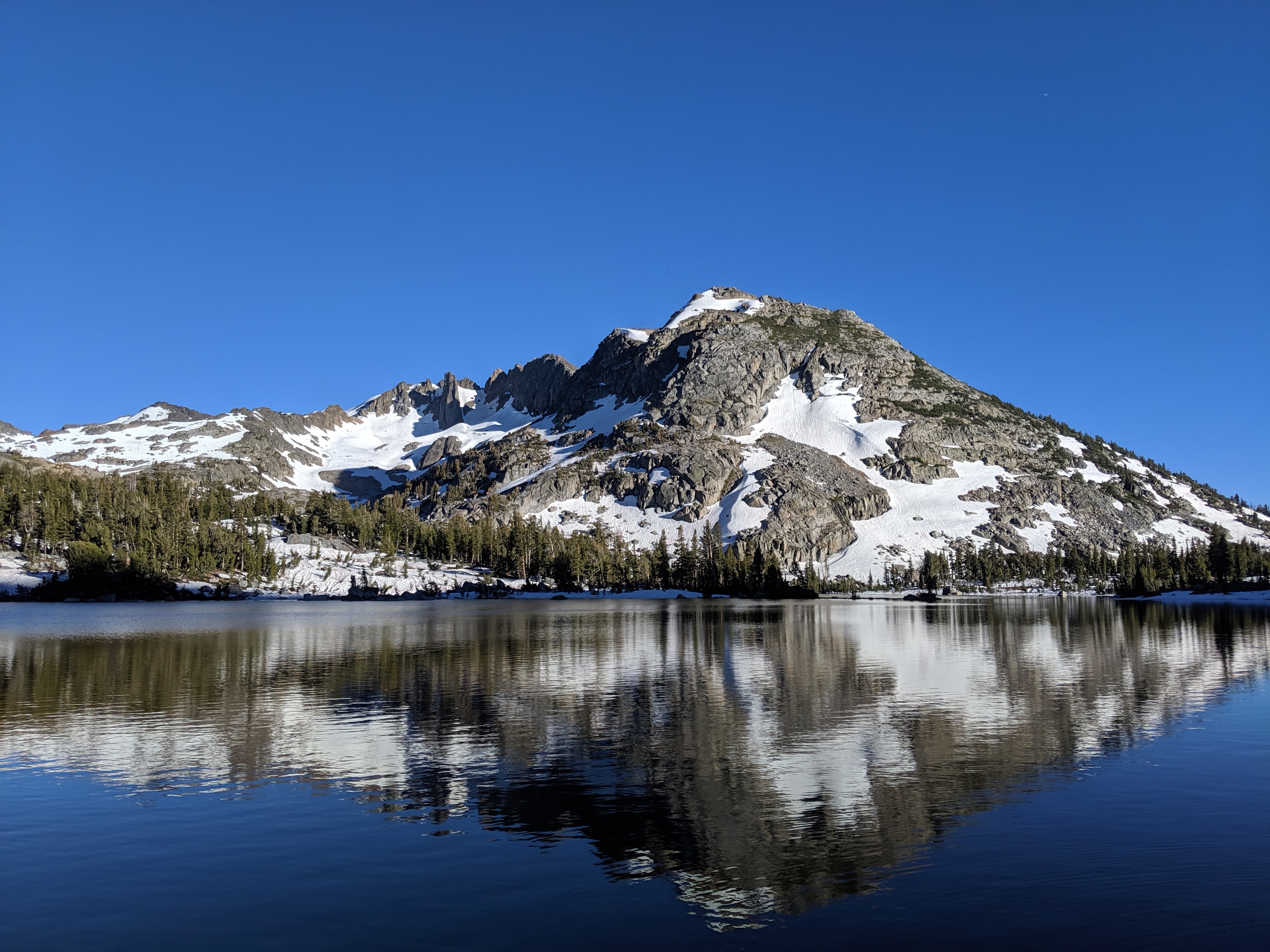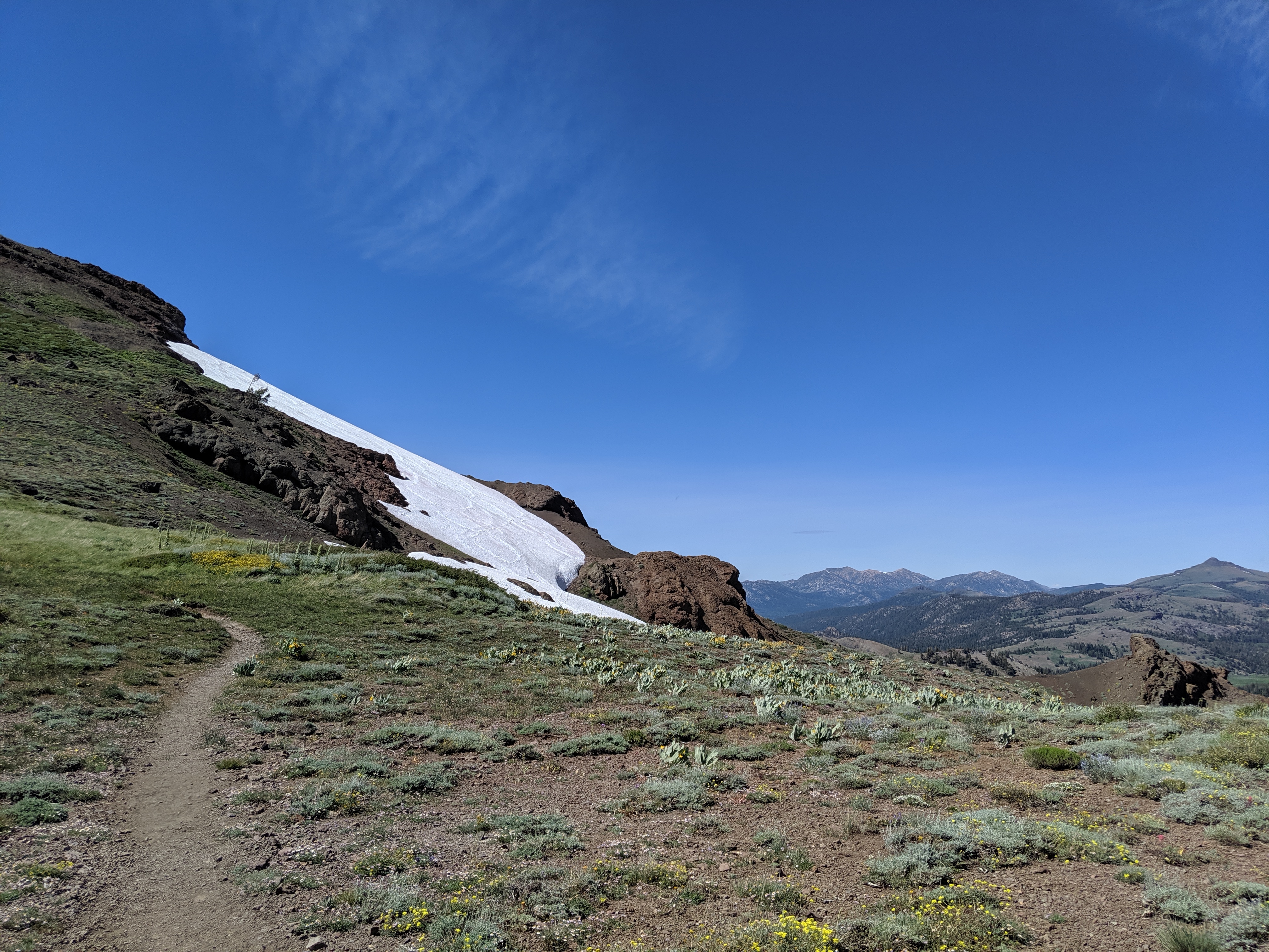 The rest of the day was as predictedārelatively mellow grades, no water crossings requiring getting wet, and amazing views of the waning mountains and retreating snow. I deliberately went slow and stopped shortly after 4 PM just so I wouldnāt be too bored tomorrow. My plan is to hike to just a couple of miles away from HWY 50, and then hitch into South Lake Tahoe early on Thursday.