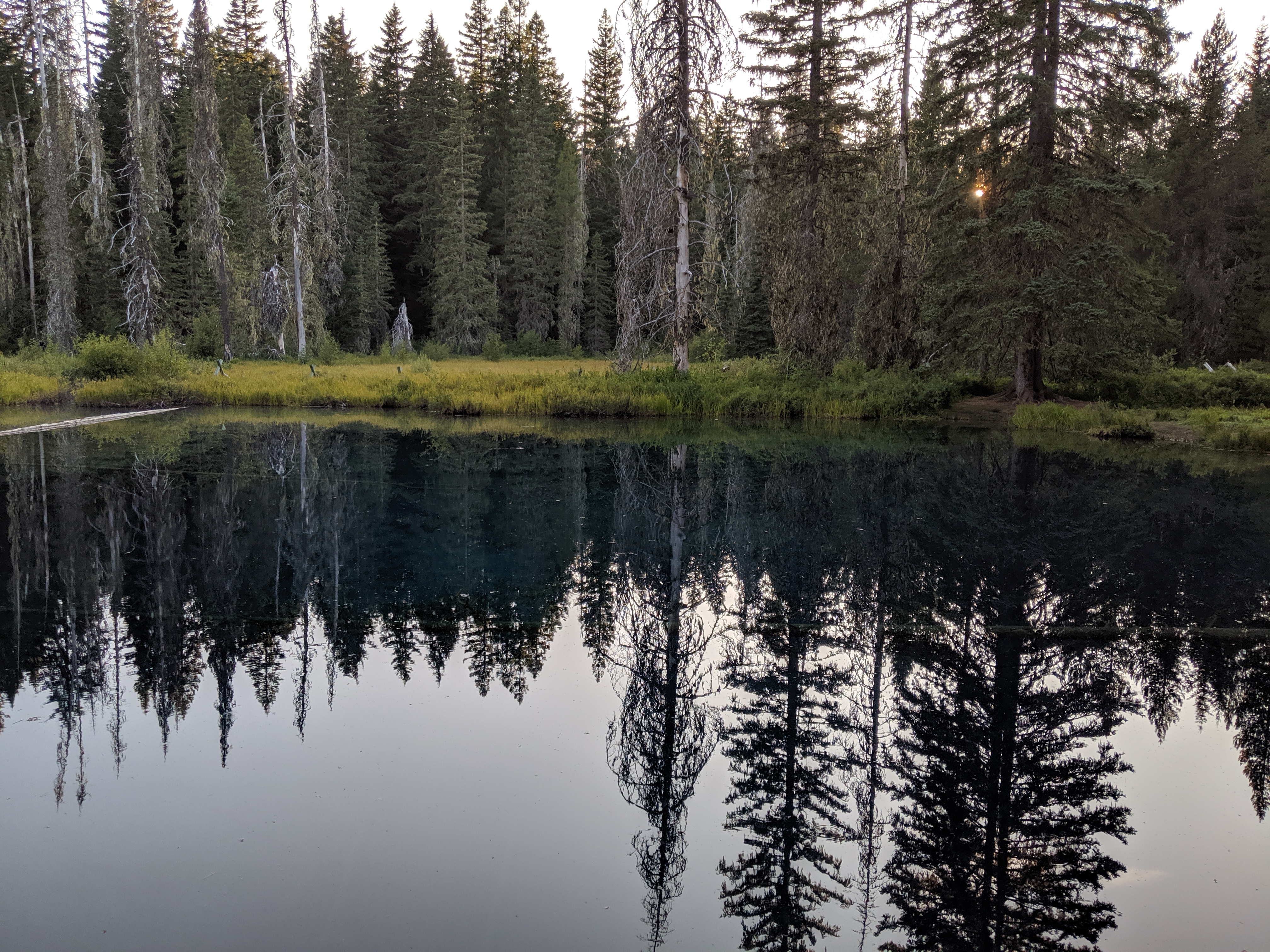 I got out of there soon to tackle my big day ahead, and after many uneventful miles I finished my day near Little Crater Lake. The photos don’t do it justice. The water was so blue and clear. You could see 45 ft. straight to the bottom. It was gorgeous.