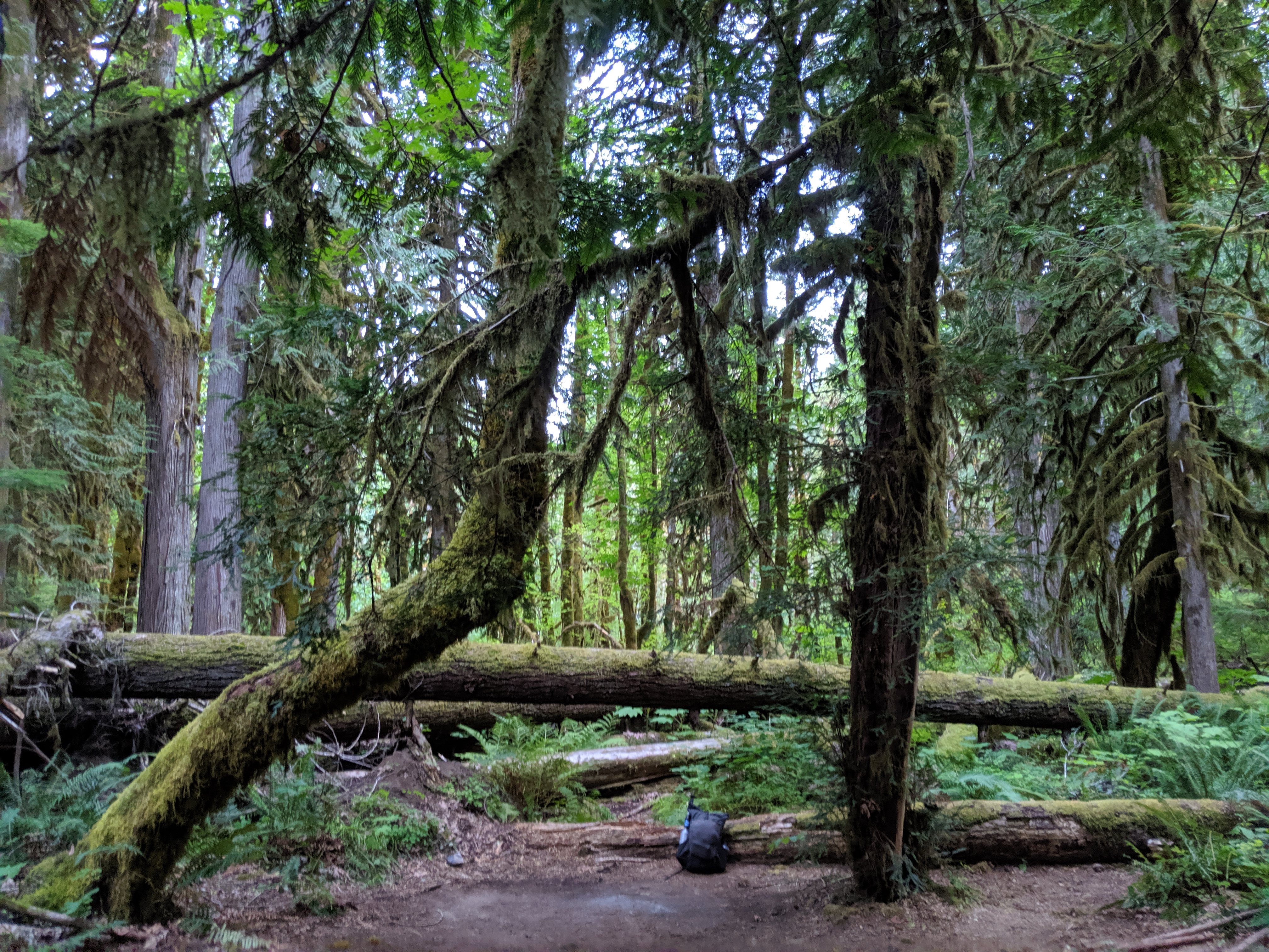 My legs (namely shin and feet) we’re feeling great so I decided to push to a good campsite before another big climb. And what did I see when I got there? The whole campsite is surrounded by those old growth trees. So cool.