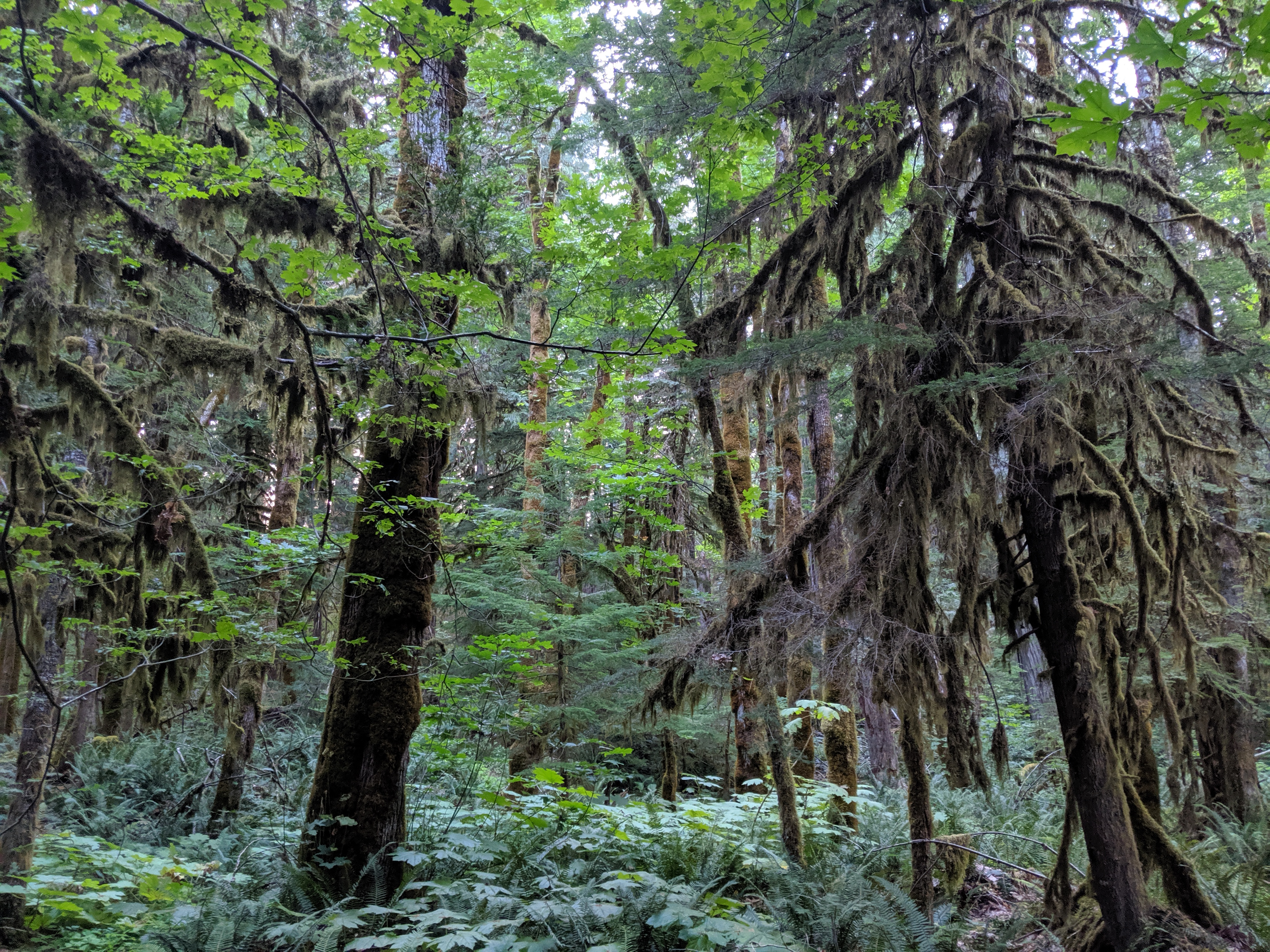Around 1 PM the sun startrd shining through as I was descending into hills and mountainsides near Carson. The terrain was pretty familiar with one exception: I kept passing by old growth trees. These trees were sometimes massive, sometimes slender, but always with tons of character. Often times there was years of miss hanging from the bark and branches. Often they were surrounded by ancient looking ferns. It was a trippy but awesome sight. I felt like I was walking through Isla Nublar from Jurassic Park. The trees and foliage were so historic.