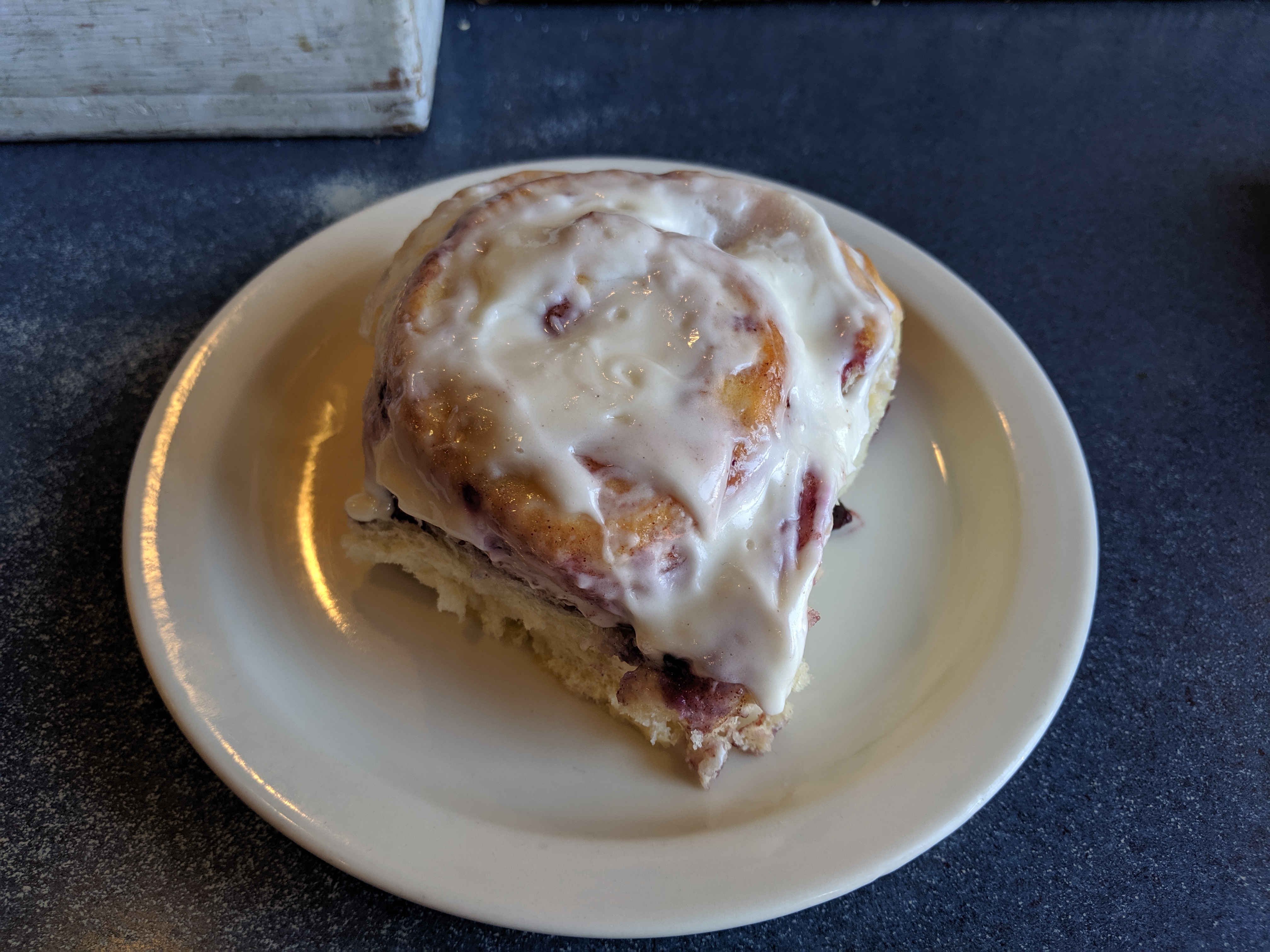 After a relaxing morning to Forest Service Road 23, I took the well-organized shuttle into Trout Lake. I dropped my pack at the general store, started charging my battery, and headed to the Station Cafe across the street. Their menu had huckleberry everything, but it was pricey. I settled on the huckleberry cinnamon roll with cream cheese frosting. It was amazing!