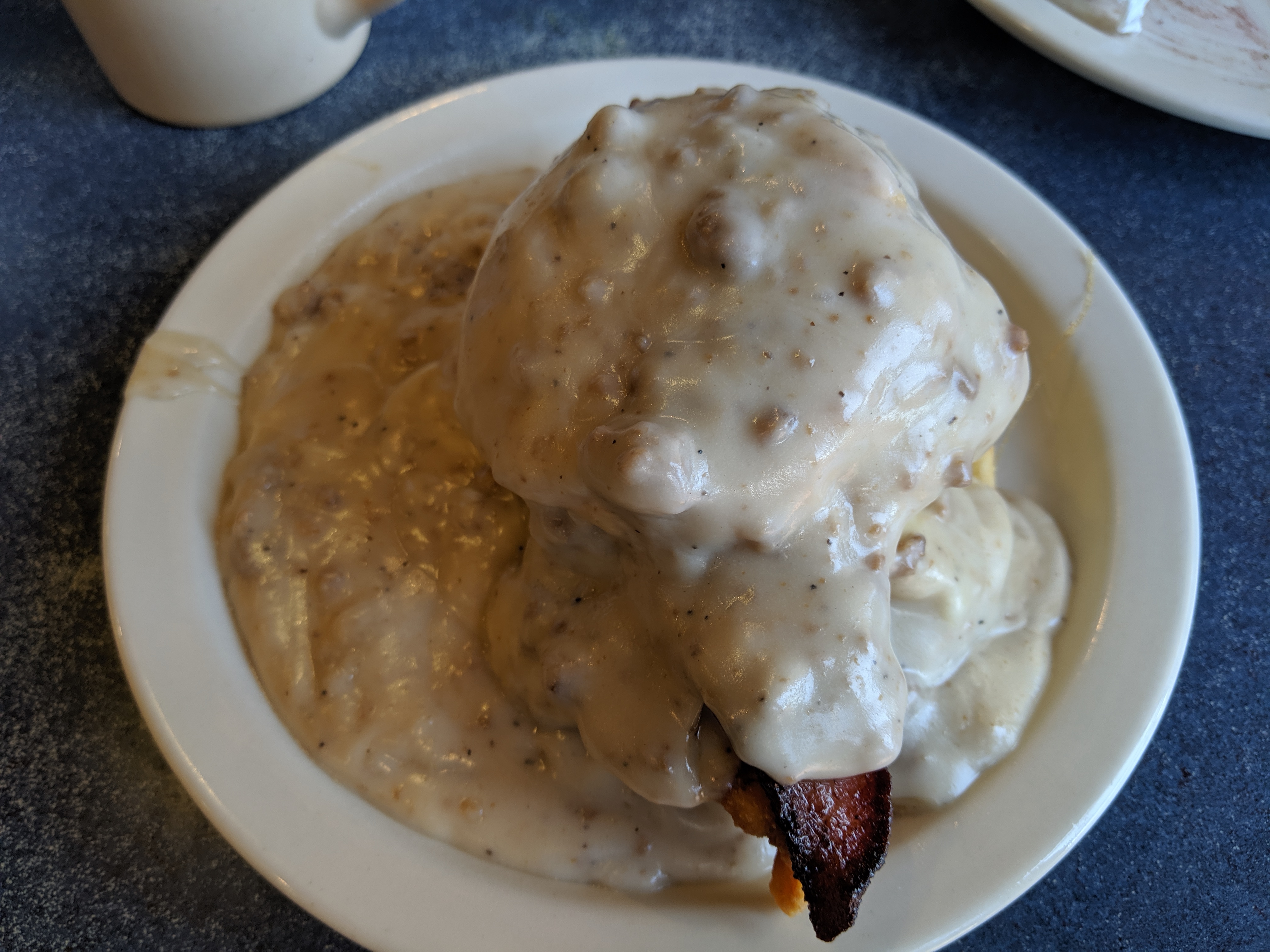 My main breakfast course then came: chicken on a biscuit with bacon and a fried egg, topped with gravy. Also amazing.
